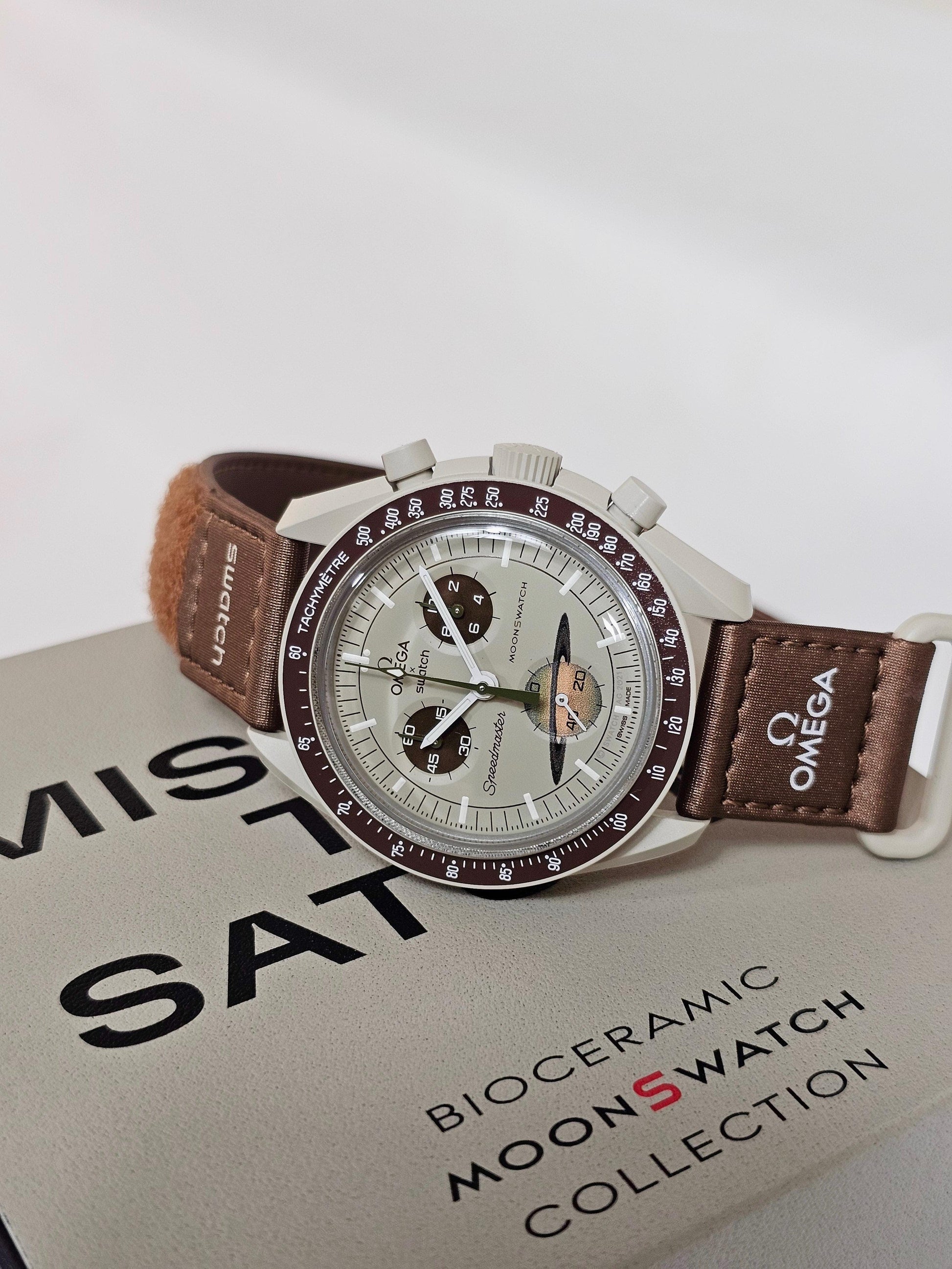 The Omega x Swatch MoonSwatch "Mission to Jupiter" is a tribute to space exploration, blending the iconic Speedmaster design with Swatch’s innovative bioceramic material. This lightweight yet durable timepiece features a warm beige dial with brown subdials and tachymeter bezel, embodying the essence of the gas giant, Jupiter.