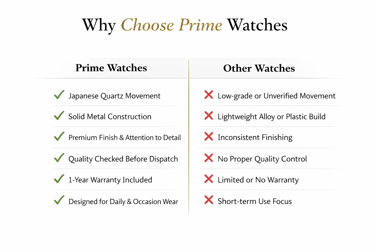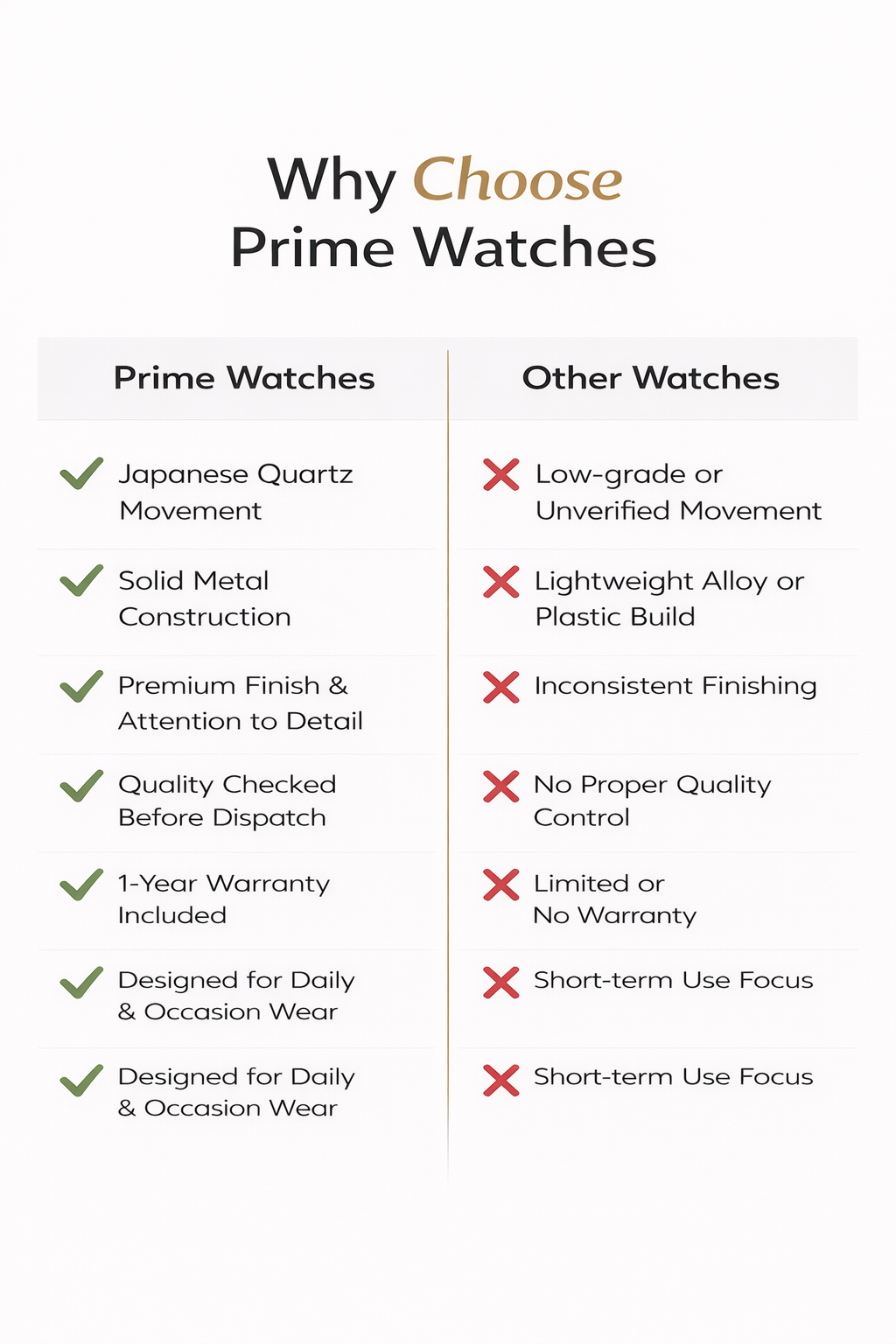 All Prime Watches use Japanese Quartz Movement, ensuring accurate timekeeping and long-lasting performance.