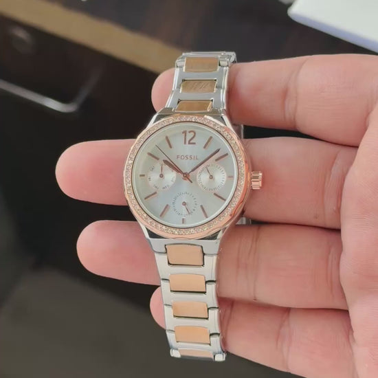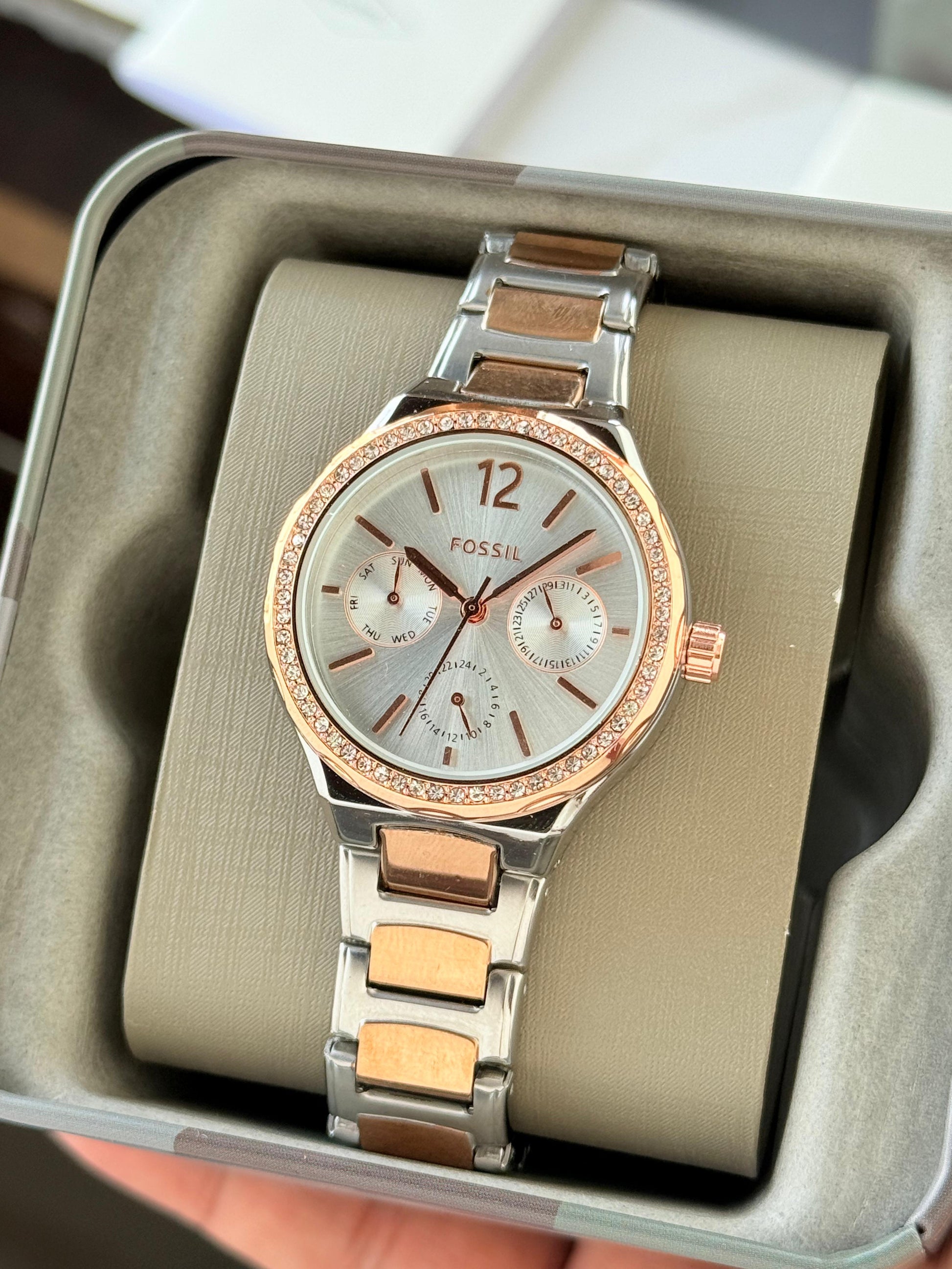 Designed for women who love elegant details with everyday comfort, the Fossil Eevie Collection blends refined aesthetics with reliable multifunction performance. Featuring a graceful white dial, rose gold accents, and a premium two-tone bracelet, this watch delivers timeless style with practical functionality.